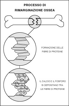 Le sostanze nutritive possono essere daiuto. Nel processo di rimarginazione, un ponte di tessuto composto per la maggior parte di fibre di proteine cresce attraverso le estremità delle ossa rotte. Il calcio e il fosforo si depositano quindi tra queste fibre di proteine per formare nuovo tessuto osseo. La dieta dovrà quindi essere ad alto tenore proteico ed equilibrata in calcio e fosforo. In ogni caso, lassunzione di calcio non dovrebbe essere troppo alta poiché potrebbe stimolare la formazione di calcoli renali durante il periodo di immobilità dovuto allingessatura. Lassunzione di vitamina D dovrebbe essere aumentata perché è essenziale per lassorbimento del calcio e del fosforo.