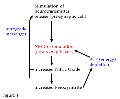 How can we understand this fusion theory? When you look at the two precursor theories together, you immediately see ways in which they interact with each other. Long term potentiation, the mechanism behind neural sensitization, involves certain receptors at the synapses of nerve cells called NMDA receptors. These are receptors that are stimulated by glutamate and aspartate and when these receptors are stimulated to be active, they produce in turn, increases in nitric oxide and its oxidant product, peroxynitrite. So immediately you can see a possible interaction between the two theories. Furthermore, nitric oxide can act in long term potentiation, serving as what is known as a retrograde messenger, diffusing from the cell containing the NMDA receptors (the post-synaptic cell) to the cell that can stimulate it (the pre-synaptic cell), making the pre-synaptic cell more active in releasing neurotransmitter (glutamate and aspartate). In this way, NMDA stimulation increases the activity to the pre-synaptic cell to stimulate more NMDA activity. Thus we have the potential for a vicious cycle in the brain, with too much NMDA activity leading to too much nitric oxide leading to too much NMDA activity etc (see Figure 1, below). There is also a mechanism by which peroxynitrite may act to exacerbate this potential vicious cycle. Peroxynitrite is known to act to deplete energy (ATP) pools in cells by two different mechanisms and it is known that when cells containing NMDA receptors are energy depleted, the receptors become hypersensitive to stimulation. Consequently nitric oxide may act to increase NMDA stimulation and peroxnitrite may act to increase the sensitivity to such stimulation. With both nitric oxide and peroxynitrite levels increased by NMDA receptor activity, an overall increase in these activities may lead to a major, sustained increase in neural sensitivity and activity. The only thing left is to explain how hydrophobic organic chemicals or pesticides can stimulate this whole response. I'll discuss that below.