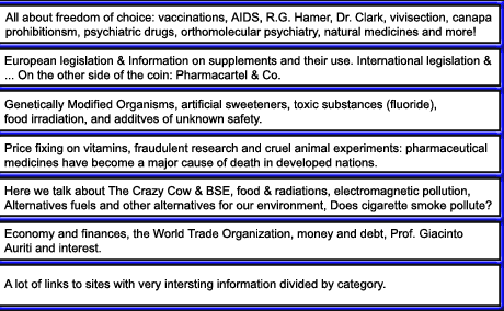 ![]() ![]() See the latest articles published on this site Copy this address and put it in you news reader! http://www.laleva.cc/news.xml Main languages: FAVOURITE LINKS: ![]() ![]() Health Freedom Movement ![]()