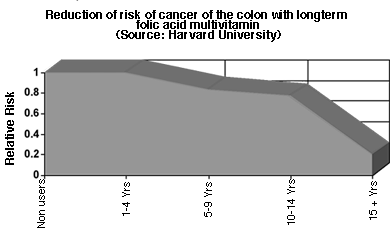 Harvard University recently released a report on the prevention of cancer of the colon. Top of the pops were exercise and longterm folic acid containing multivitamin supplementation. Harvard University has been undertaking a longitudinal study of nearly 100,000 nurses for about twenty years. Their research has shown that the impact of folic acid supplementation reduces cancer of the colon by a massive 75-80%. (See figure 2.)